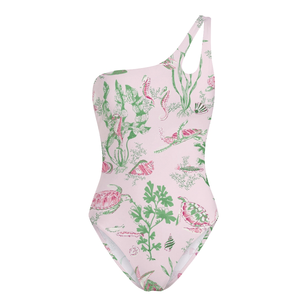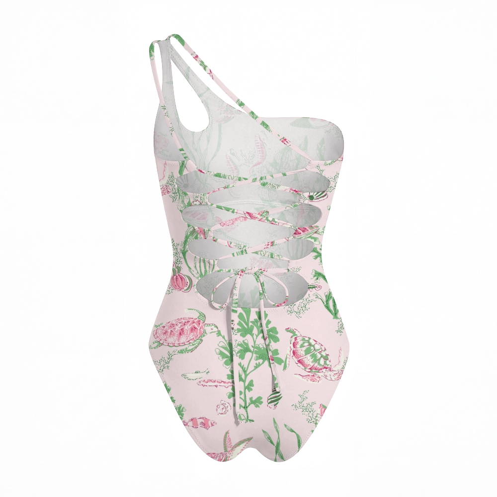 Marine Turtle Seaweed Print One Shoulder Lace Up One Piece Swimsuit