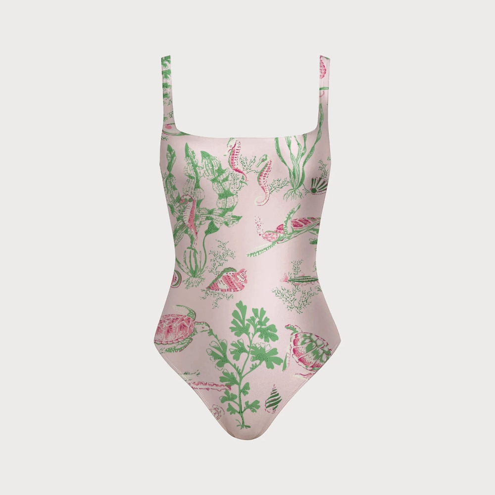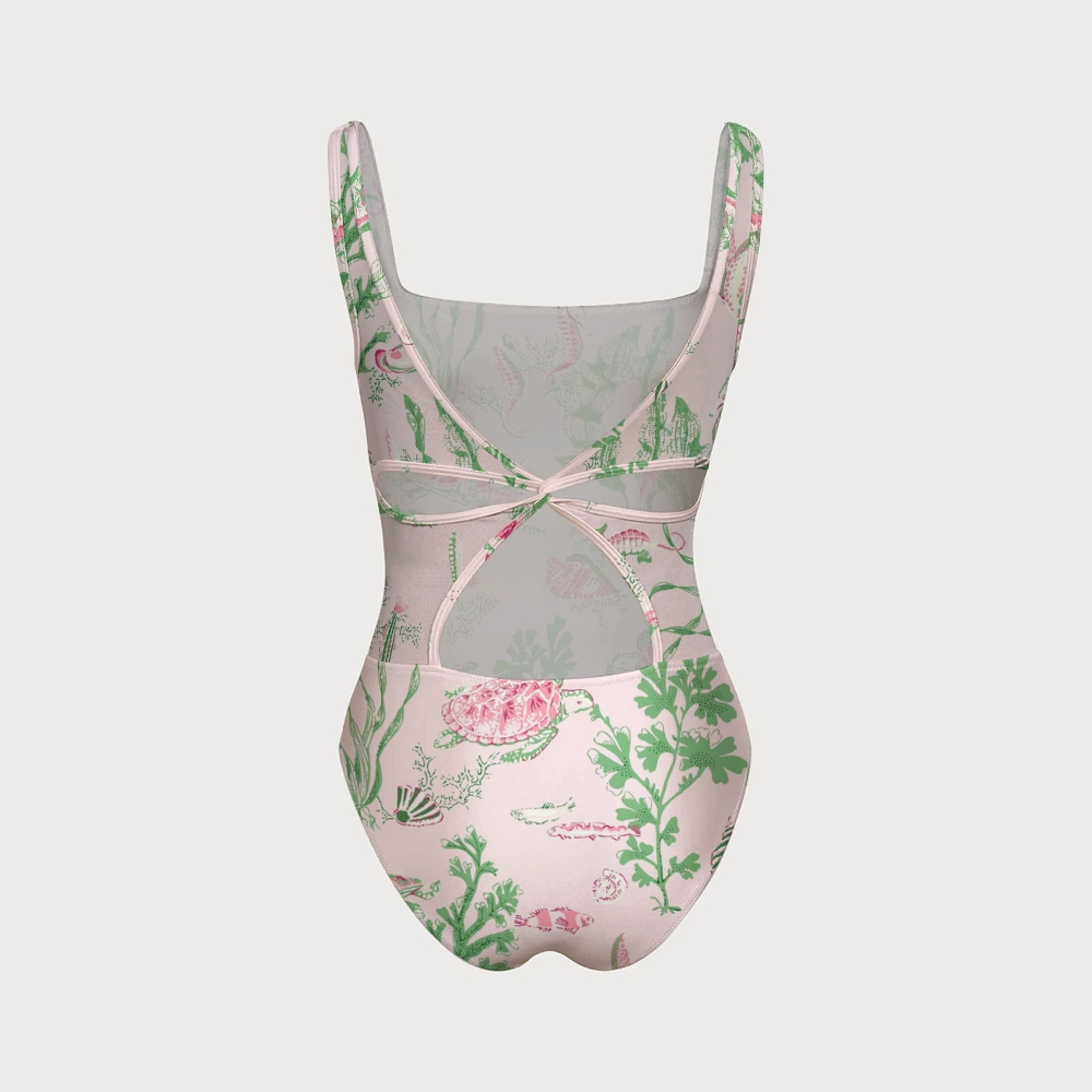Marine Turtle Seaweed Print Square Neck Backless One Piece Swimsuit