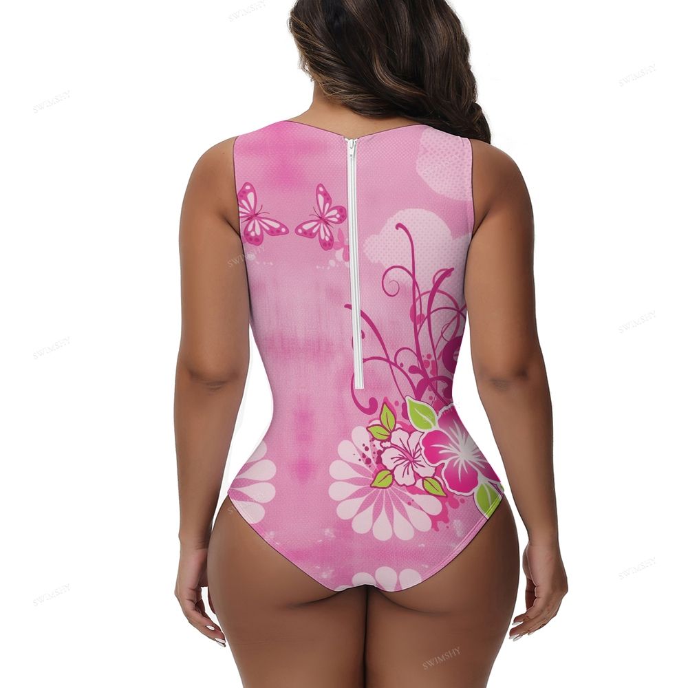 Pink Hibiscus & Butterfly Print Round Neck Back Zip One Piece Swimsuit