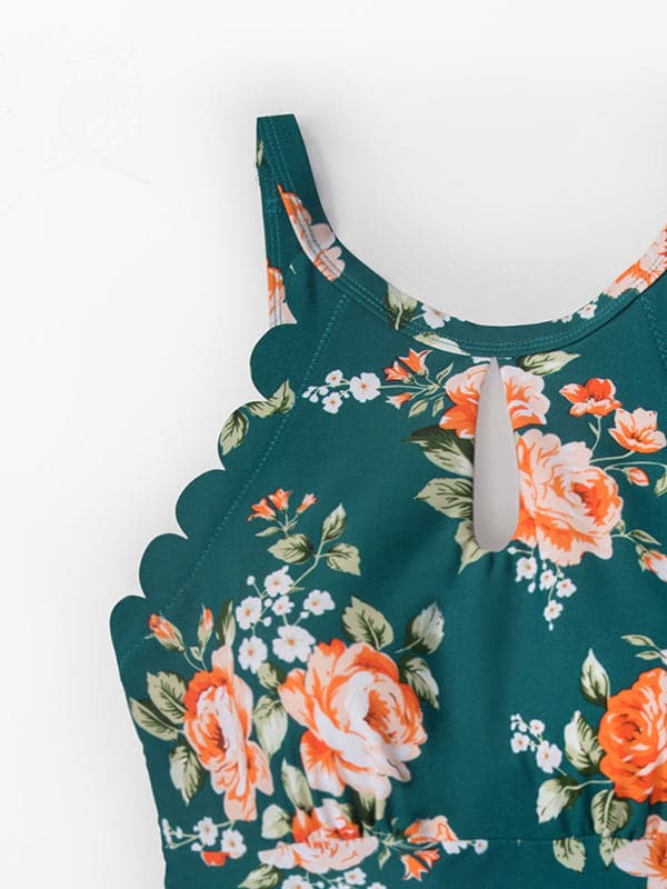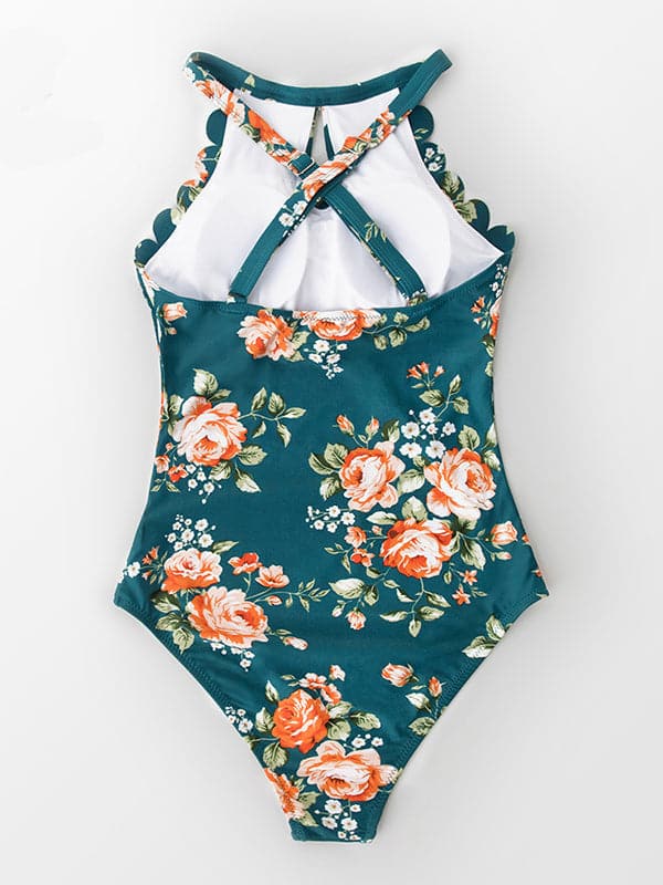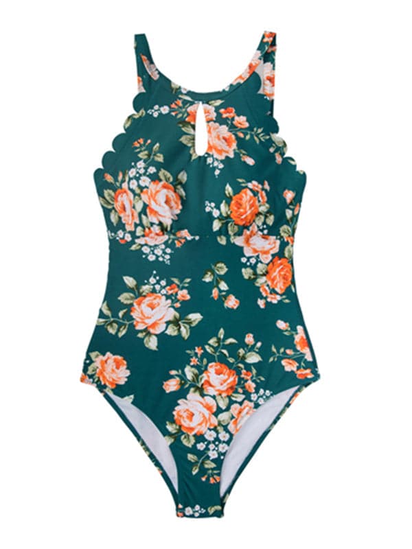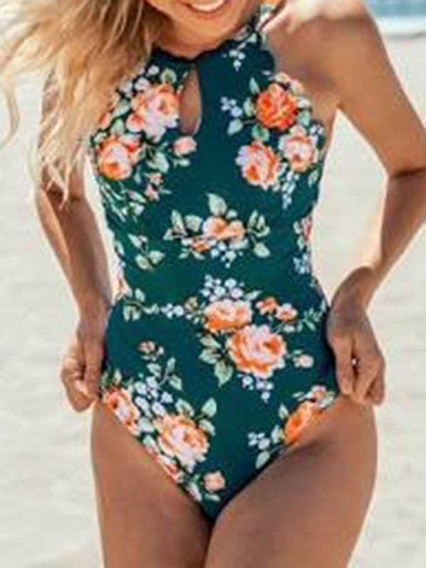 Sleeveless U Neck Floral-Print Hollow Swimwear