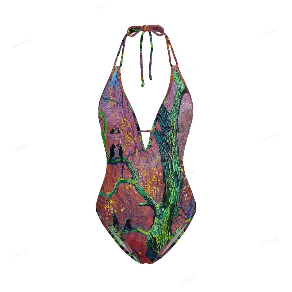 Tree & Raven Oil Painting Print Halter V Neck Tie Back One Piece Swimsuit