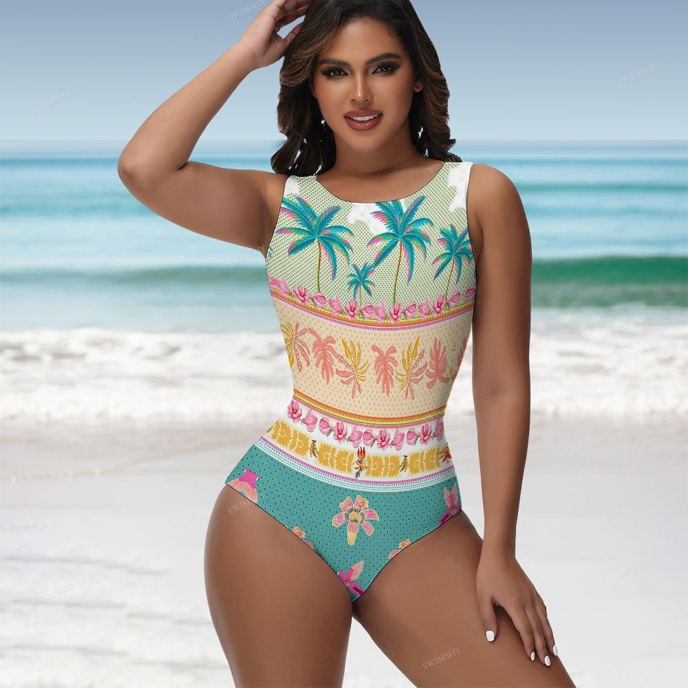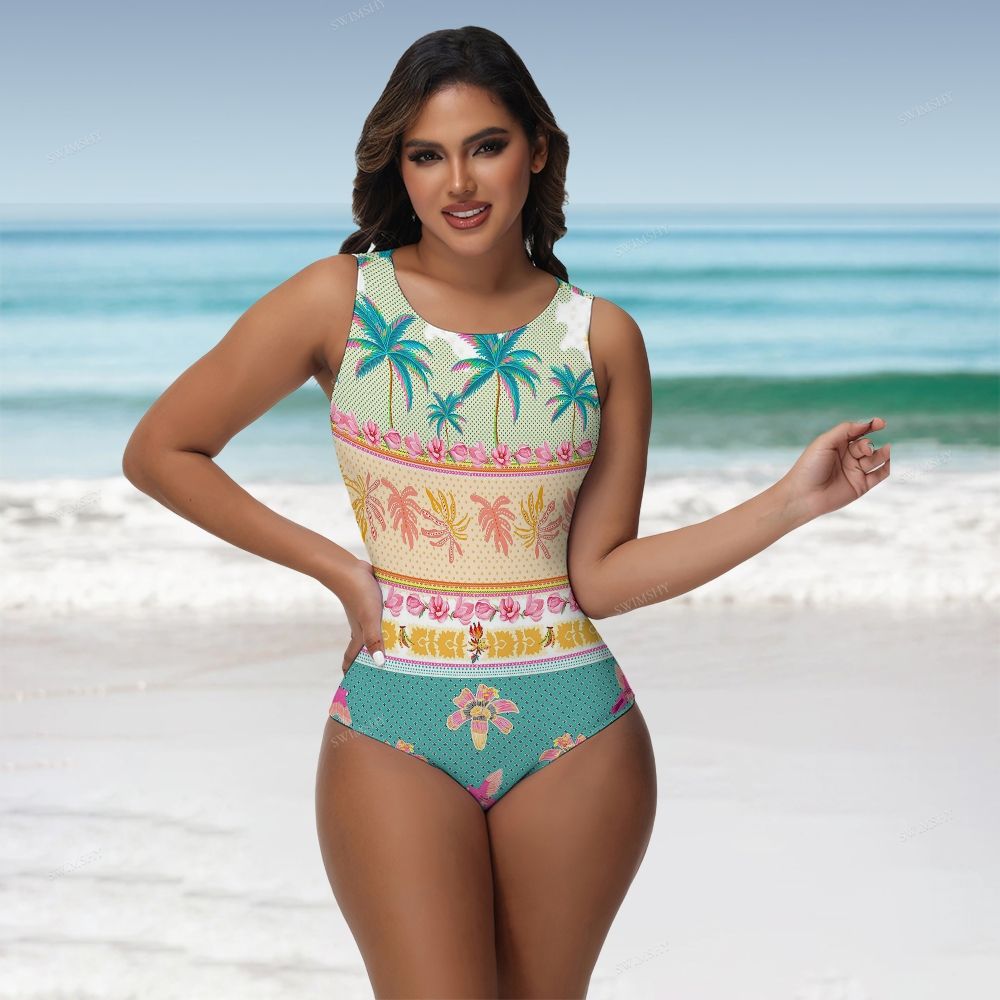 Tropical Palm Tree Floral Border Print Round Neck Back Zip One Piece Swimsuit